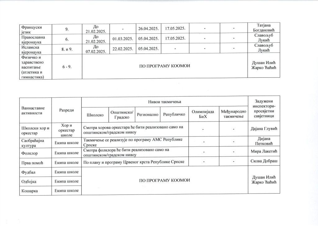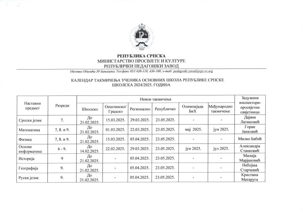 КАЛЕНДАР ТАКМИЧЕЊА