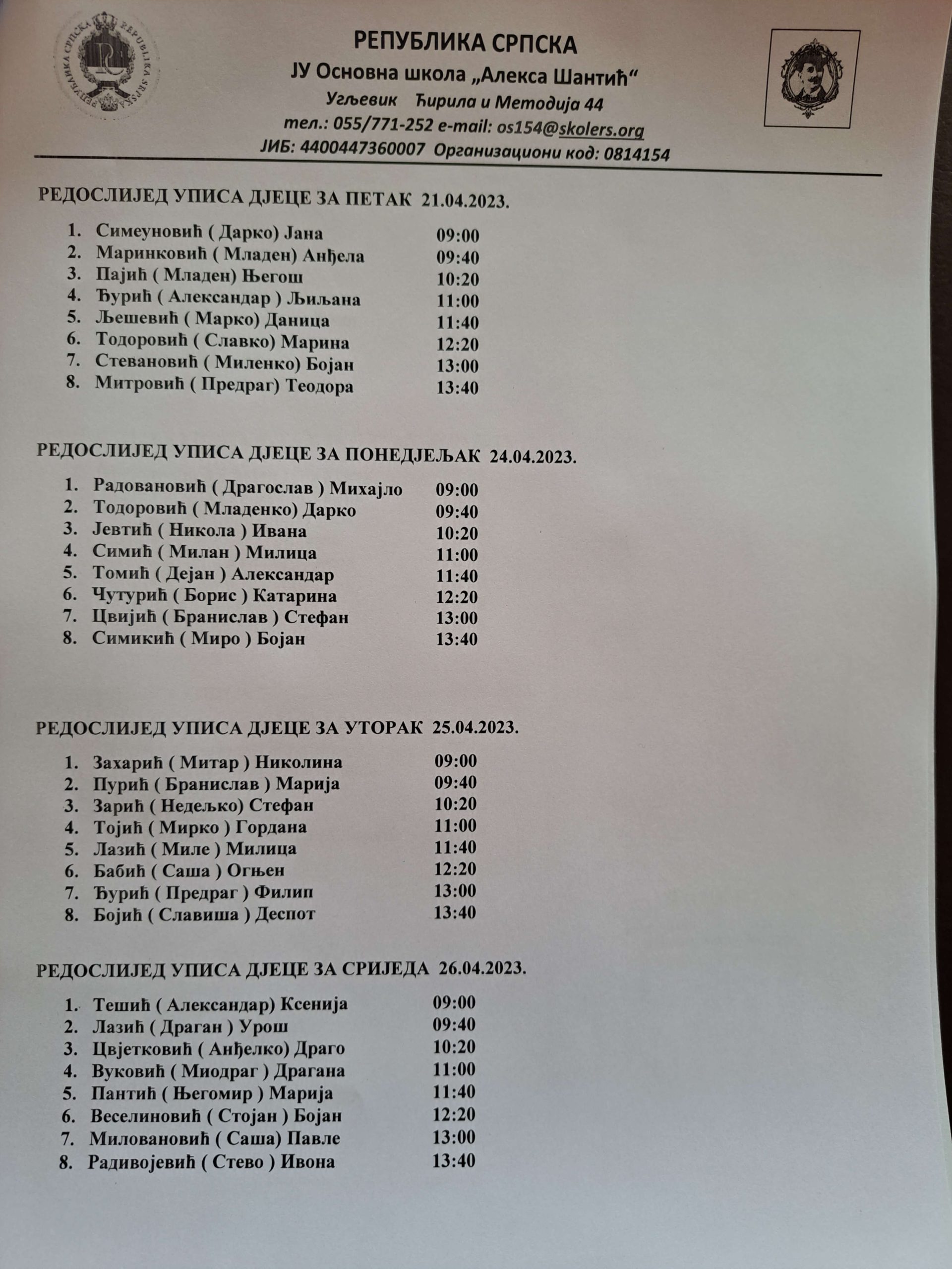 Распоред уписа дјеце у први разред школске 2023/2024. године